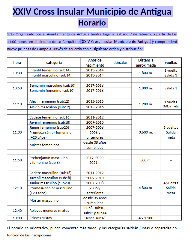 Las diferentes pruebas comenzarán a partir de las diez y media de la mañana. Una vez que hayan llegado todas las expediciones de los clubes de la Maxorata. También los atletas populares que siempre acuden a este tipo de carreras. Para concluir sobre las 14,00 horas con la entrega de trofeos a los primeros clasificados de cada categoría. La novedad que este año presenta el Cross Insular Municipio de Antigua es la celebración como últimas pruebas del programa de dos carreras de relevos mixtos. Cada club puede presentar hasta dos equipos.
